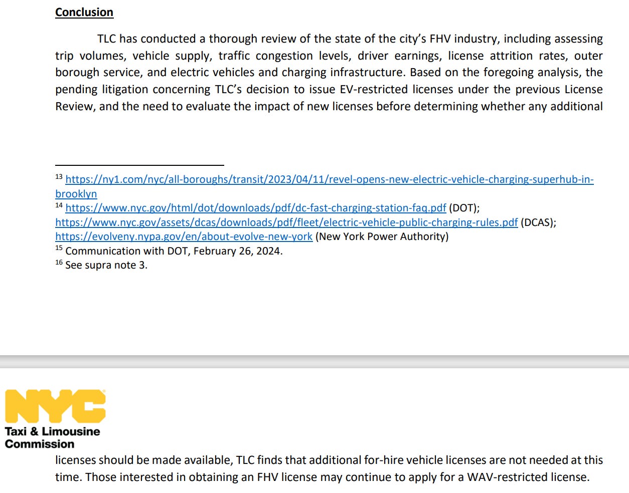 βTLC has conducted a thorough review of the state of the cityβs FHV industry, including assessing trip volumes, vehicle supply, traffic congestion levels, driver earnings, license attrition rates, outer borough service, and electric vehicles and charging infrastructure. Based on the foregoing analysis, the pending litigation concerning TLCβs decision to issue EV-restricted licenses under the previous License Review, and the need to evaluate the impact of new licenses before determining whether any additional licenses should be made available, TLC finds that additional for-hire vehicle licenses are not needed at this time. Those interested in obtaining an FHV license may continue to apply for a WAV-restricted license.β