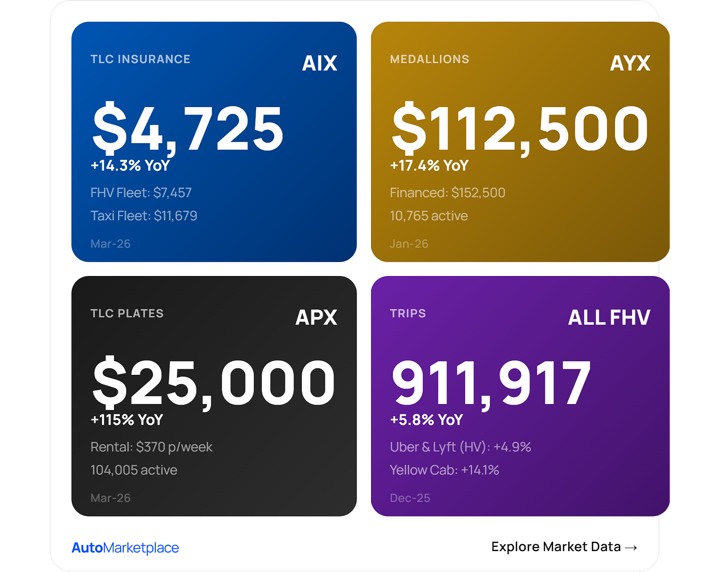 AutoMarketplace.com is a data intelligence and market infrastructure platform for New York City’s for-hire vehicle ecosystem—delivering proprietary indexes (AYX, APX, AIX), real-time analytics, and marketing services across taxi medallions, TLC plates, and commercial insurance.
