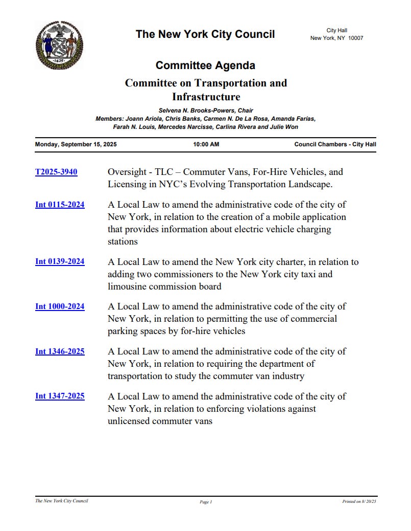 On Monday, the City Council’s Committee on Transportation and Infrastructure, chaired by Selvena N. Brooks-Powers, held a hearing on a slate of bills that could reshape how taxis, for-hire vehicle (FHVs), including commuter vans, and TLC-licensed drivers operate in New York City.