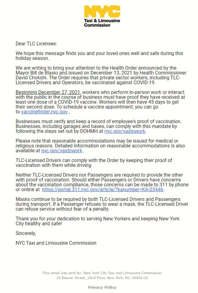 NYC TLC Email Indicates Vaccine Mandate Will Be Enforced By Dec 27th. Will It Cause A Driver Shortage?