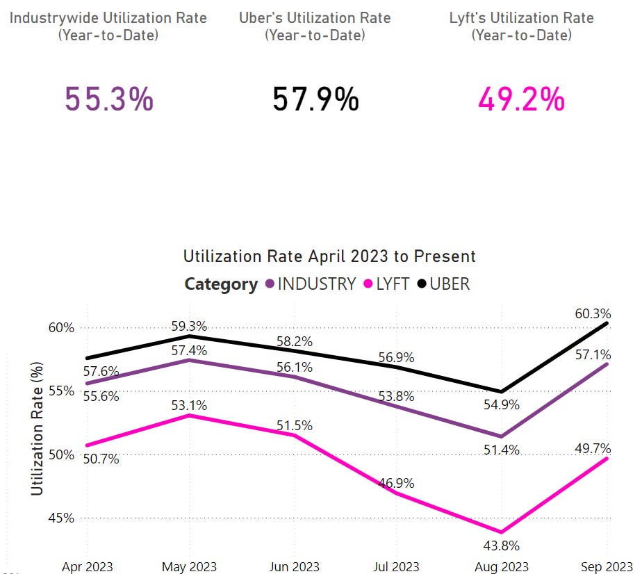 Uber & Lyft's NYC utilization rates (UR), or how busy a driver is kept while on the apps, jumped in September. Risk of app lockouts decrease, but taxi industry & other FHV sectors still struggling