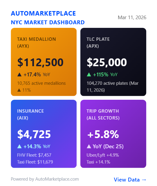 AutoMarketplace.com is a data intelligence and market infrastructure platform for New York City’s for-hire vehicle ecosystem—delivering proprietary indexes (AYX, APX, AIX), real-time analytics, and marketing services across taxi medallions, TLC plates, and commercial insurance.